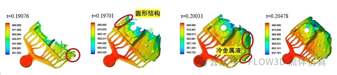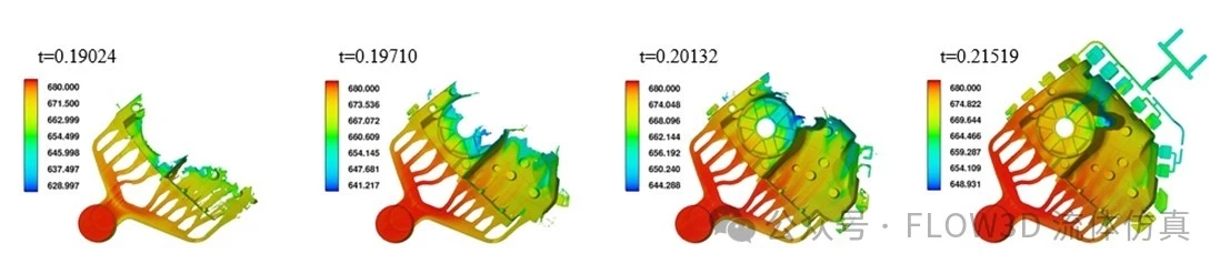 溫度場(色標代表溫度):(a)t=0.190s; (b)t=0.197s; (c)t=0.200s;(d)t=0.204s.