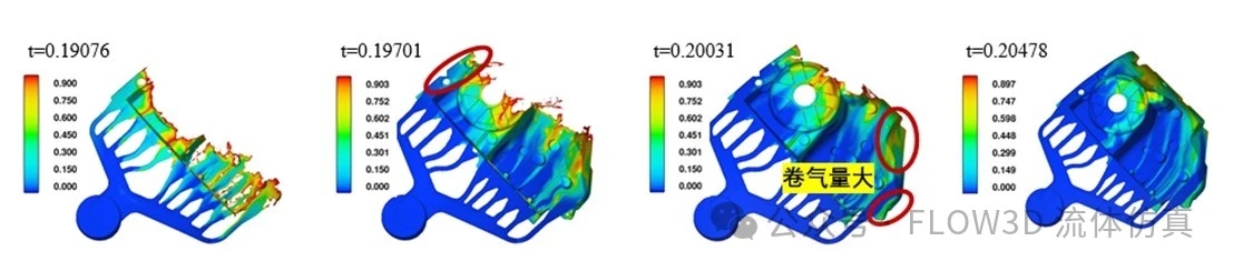 卷氣(色標代表卷入氣體體積分數):(a)t=0.190s; (b)t=0.197s; (c)t=0.201s; (d)t=0.215s. 圖5 帶澆注系統和溢流槽、排氣道的模擬結果:溫度場及卷氣情況 圖5為金屬液在有澆注系統以及溢流槽、排氣道的壓鑄模具中的充型過程。可以看出,在金屬液充型過程中,位于液-氣界面前沿的溫度較低、卷氣嚴重的部分金屬液全部進入設計好的溢流槽中,金屬液充滿模腔后(圖5(d)),留在零件內部的氣體量極少。因此,設計的溢流槽、排氣道適用于該減震塔零件的壓鑄工藝。