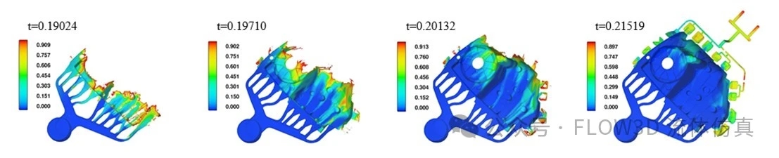 圖2 減震塔澆注系統 2.2 溢流槽、排氣道設計 溢流槽用于儲存液-氣接口前端混有氣體和涂料殘渣的冷污金屬液,與排氣道配合,能夠迅速引出模腔內的其氣體,減小充型過程中卷氣的發生,同時也能轉移縮孔、縮松、渦流包氣和產生冷隔的部位。但是,要發揮溢流槽的作用,溢流必須根據金屬液在模腔中的流動特征,在合理位置接受前沿冷污金屬液并將其保留在溢流槽中,因此,溢流槽也需要合適的尺寸。既不能過大也不過小,過大會導致廢料增多,增加成本;過小會導致溢流槽不能接受全部的冷污金屬,而降低鑄件品質。因此,先對設計好澆注系統的零件先進行數值仿真,然后根據金屬液的流動特征確定合適的溢流系統是一種高效的設計手段。 根據實際的壓鑄工藝參數設定模擬參數,金屬液先在慢壓射速度0.6m/s下進入橫澆道和內澆口,當金屬液充滿所有內澆口后,壓射速度提高到5m/s,即讓金屬液在快速下充填模腔。