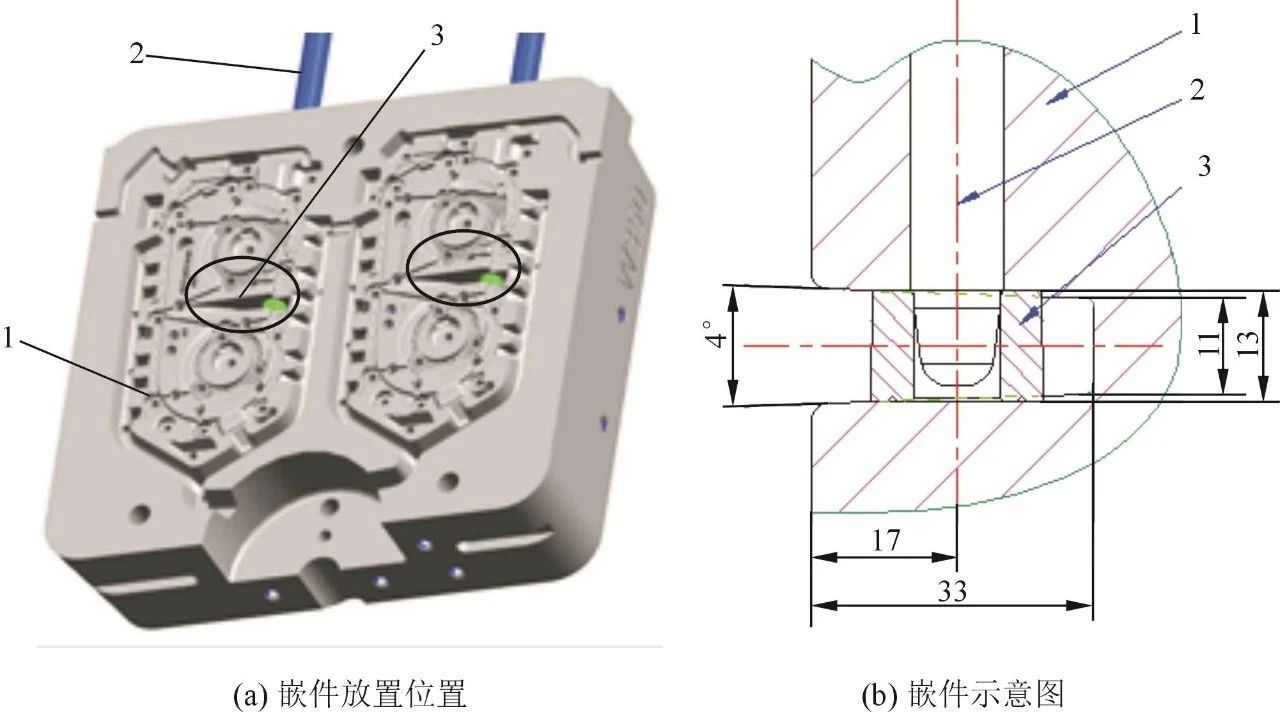 圖5 嵌件 吊耳處?20mm的吊裝孔附近局部體積厚大,充型緩慢,容易引起滯氣及收縮缺陷。為減少吊耳厚壁處的縮孔縮松,提高鑄件內部品質,采用嵌鑄工藝。嵌鑄是把金屬零件(嵌件)先放在壓鑄模內,再與壓鑄件鑄在一起,以消除鑄件局部熱節,減小鑄件壁厚,防止縮孔產生。由于該鏈條罩蓋外形結構較簡單,鑄件在最大輪廓處分型后,兩側包緊力沒有明顯的差異,因此在確定分型面后,將鏈條罩蓋吊耳孔處需要設計側抽芯結構的成形部分設計在動模,同時將周邊法蘭面上的預鑄孔型芯也設計在動模,可以增大動模部分的包緊力,避免開模后鑄件留在定模型腔。這種分型設計導致嵌件放置在動模型腔中,為保證嵌件在壓鑄過程動模移動時穩定牢靠,必須設計可靠的定位和壓緊方式。