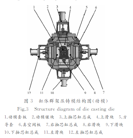 圖2 缸體群架U型澆道 模具結構見圖3,由動靜模鑲塊和4個滑塊及靜模斜抽芯組成,此模具屬于大型壓鑄模,為防止模具在生產過程中因熱膨脹影響正常的導向精度,采用方導柱、導套結構,布置在模具四角。滑塊抽芯采用液壓缸抽芯,模具設計簡單、穩定、可靠。