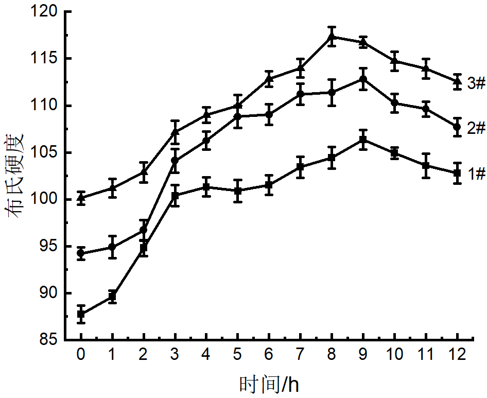 (a)1號 (b)2號 (c)3號 可以看出,3組合金的鑄態組織主要由α-Al及Al-Si共晶相組成。其中α-Al晶粒有兩種類型,分別標記為α1-Al和α2-Al。這是因為壓鑄凝固過程是一個兩階段過程,當熔化后的鋁液倒入壓室,壓室內相對較低的溫度能夠將鋁液冷卻至液相線溫度以下,此時α1-Al晶粒在壓室中開始形核并生長,因此也被稱為壓室預結晶。這些晶粒伴隨著未凝固鋁液一同進入模具型腔,因為有充足時間長大,造成最終尺寸較粗大。在模具型腔填充過程中,由于冷卻速率非常快,因此形成了更細小、形狀也更為圓整的α2-Al晶粒。經Sr元素變質后的共晶Si呈纖維狀,同時在共晶區存在呈現出多邊形的富Fe相,通過EDS能譜分析確認其為α-Fe相。
