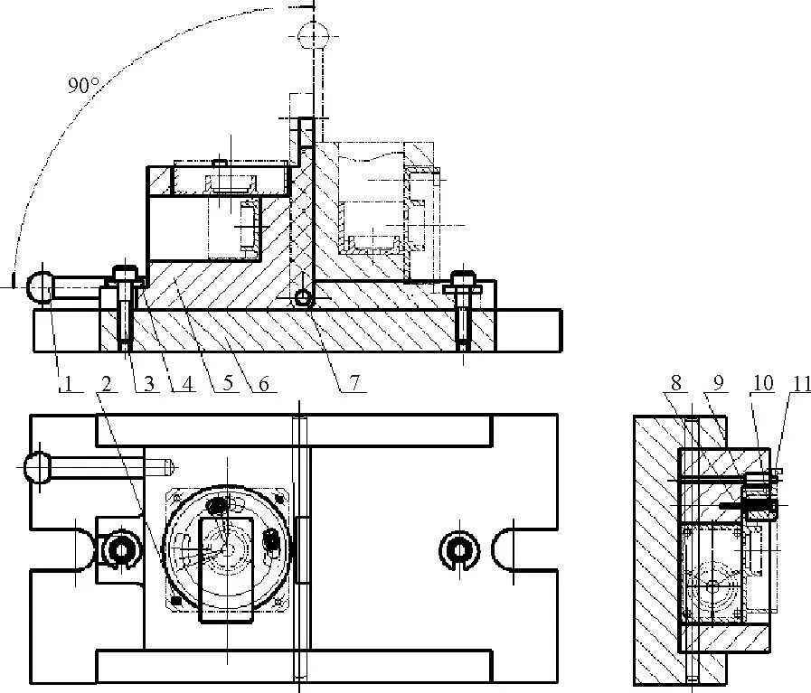 圖3 帶減速箱端蓋銑床夾具 為滿足與軸承和定子的裝配要求,需將所獲壓鑄件進行必要的后續加工處理,以便兩處軸承室和止口尺寸車削或銑削至精度和形位公差達到要求,但由于端蓋形狀的特殊性,致使車削加工時即使有車夾具支持也無法實現一次裝夾完成兩個空間正交軸承孔的加工,因此,考慮采用銑夾具來解決上述問題,見圖3。 夾具體5(見圖4)置于底座6之上,繞轉軸7在0°~90°之間翻轉,并且0°和90°是兩個工作位置,手柄與夾具體插孔采用間隙配合以便完成插入翻轉后立即拔出(否則會妨礙銑削加工),同時夾具體5的一個固定槽剛好穿過底座上的夾具體鎖緊螺釘3,在固定槽和夾具體鎖緊螺釘3的頭部之間插入開口墊片4,再擰緊螺釘3即限制了夾具體最后一個轉動自由度。基于壓鑄件尺寸一致性程度高的特點,端蓋鑄件在夾具體采用一面兩銷定位,即利用端蓋4-?5mm安裝孔中的2個對角孔分別套入一個定位圓銷2和一個菱形銷11。當轉位壓塊10轉至指定位置時只需旋緊壓塊螺釘8即可鎖緊端蓋零件。