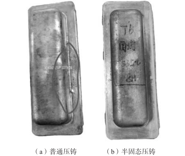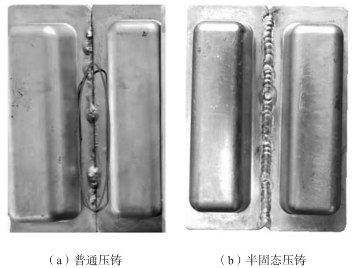 圖12 焊接后的壓鑄件 4 結論 (1)通過采用智鑄超云—壓鑄領域專業CAE云平臺對設計的不同壓射工藝方案進行壓射過程模擬分析,結果表明,采用五段低速射出模式B壓鑄工藝方案時,可使合金液在壓室中流動平穩,呈層流狀態,沒有出現紊流,從而避免了在壓室中裹入氣體或氧化夾渣等。 (2)根據模擬結果優化了料筒孕育半固態流變壓鑄工藝,采用五段低速射出模式B壓鑄工藝方案成功實現了扣手鑄件的半固態流變壓鑄成形,得到了合格的壓鑄件,鋁液澆注溫度為640 ℃,壓射沖頭的最高低速速度為0.7 m/s、高速速度為2 m/s,模具預熱溫度為200 ℃。 (3)扣手普通壓鑄件的組織主要呈枝晶狀或薔薇狀,內部存在較多的氣孔缺陷,不能進行T6處理和焊接加工;而扣手半固態壓鑄件內部無氣孔缺陷,組織中初生α-Al相主要呈近球狀或顆粒狀,可進行T6處理和焊接加工。 作者: