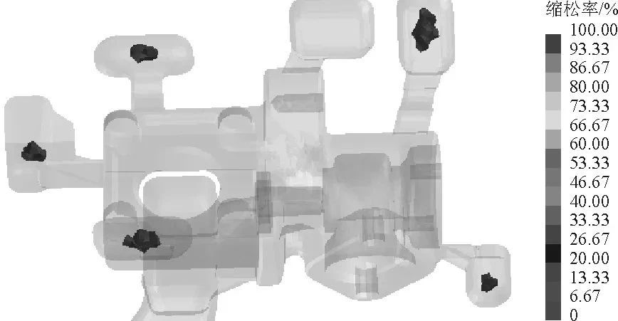 圖9 采用澆注系統2生產的鑄件縮孔分布模擬結果