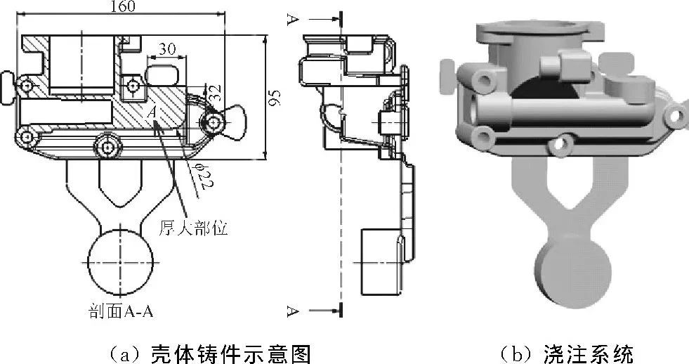 圖1 鋁合金殼體鑄件示意圖及澆注系統