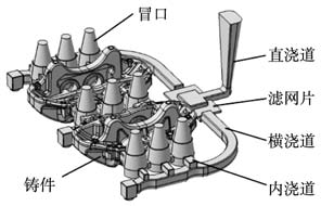 表6 優化方案結果對比 依據最優工藝方案進行生產試制,得到圖5所示的含澆注系統的制動鉗鑄件成品,可見在此金屬型重力鑄造工藝方案下能夠得到充型完整且表面光潔的鑄件。經檢驗,制動鉗鑄件成形質量較高,沒有縮松縮孔缺陷,符合預期效果,從而驗證了此優化工藝方案的可行性。