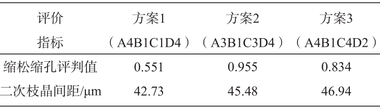 表5 均值和極差分析表 2.4 優化方案的確定及試制驗證 基于對上述工藝參數對評價指標的影響規律分析,確定的優化方案如下: (1)縮松縮孔缺陷是實際鑄件生產過程中首先需解決的鑄造缺陷,工藝方案應首先保證鑄件中無縮松縮孔缺陷,使縮松縮孔評判值最小的工藝組合方案為A4B1C1D4。在確保鑄件沒有縮松縮孔缺陷的同時,二次枝晶間距應當越小越好,以提高鑄件的力學性能。根據極差分析的結果,模具預熱溫度對二次枝晶間距的影響最大,而對縮松縮孔評判值的影響最小。由于模具預熱溫度對減小二次枝晶間距和縮松縮孔缺陷的最優水平均為C1,因此可將工藝參數組合A4B1C1D4作為第一組優化方案。(2)正交試驗的結果中有兩組工藝參數組合沒有縮松縮孔缺陷,分別是第9組(A3B1C3D4)和第13組(A4B1C4D2),因此可將該兩組的工藝方案分別作為第二組和第三組優化方案進行比較。 上述的優化方案數值模擬的結果如表6所示。3個優化方案的縮松縮孔評判值均小于1,即均不發生縮松縮孔缺陷。其中方案1的縮松縮孔評判值最小,且對應的二次枝晶間距也最小,因此,綜合上述分析,將方案1(A4B1C1D4)作為最優工藝方案,即澆注時間為28 s,澆注溫度為 700 ℃,模具預熱溫度為300℃,冷卻水溫度為 35℃。