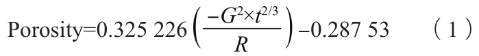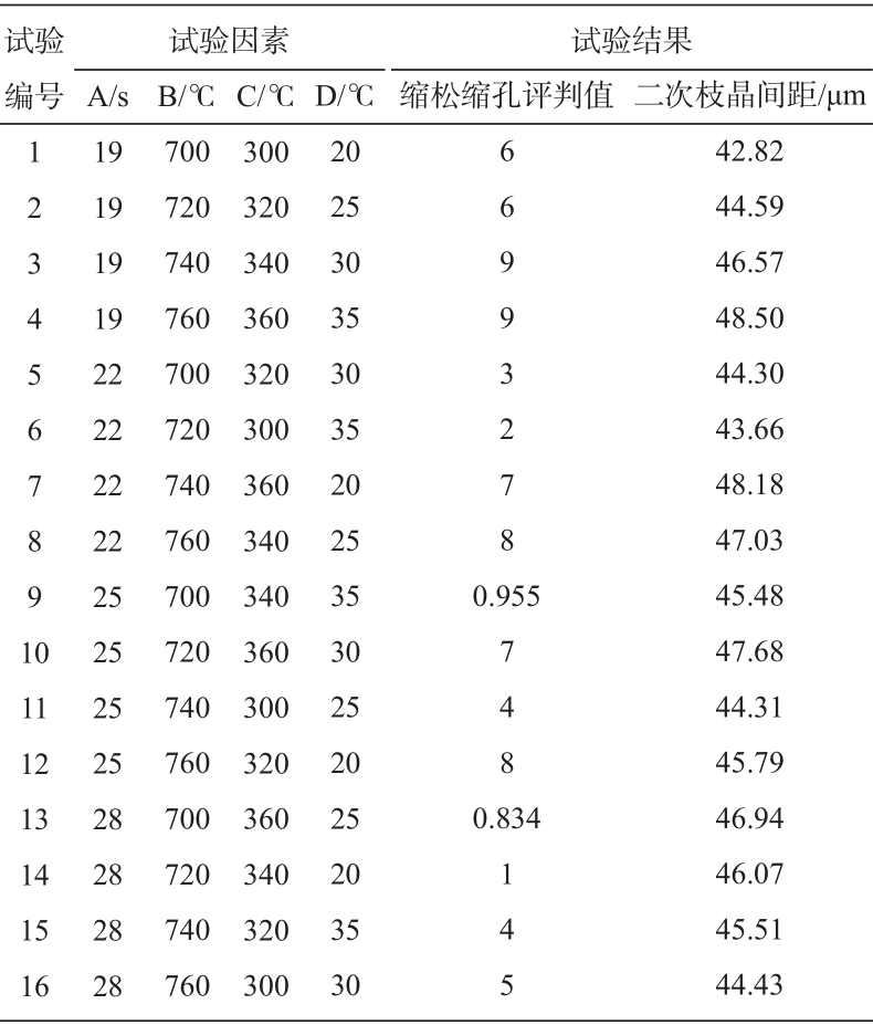 表3 正交試驗的因素和水平 本文以縮松縮孔缺陷和二次枝晶間距作為對鑄件質量的評價指標??s松縮孔缺陷是制動鉗鑄件主要的內部缺陷,其直接影響鑄件的力學性能和疲勞壽命。本文縮松縮孔缺陷的評判值是在考慮局部溫度梯度和冷卻速度的基礎上,引入局部凝固時間的適用于預測鋁合金鑄件中的縮松縮孔缺陷的判據式: