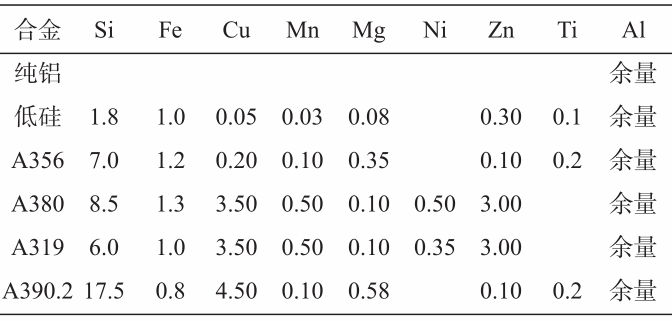 圖1 合金的流動性和相圖的關系以及流頭阻塞機理 然而流頭阻塞理論顯然不適用于描述壓鑄條件下的合金流動性問題。其一,半固態合金可在固相分數大于0.5時壓鑄充型,遠遠大于流頭阻塞理論所提出的臨界固相分數;其二,壓鑄的充型時間小于0.1 s,在這么短的充型時間內流頭的溫降不大;其三,內澆道合金液流速可大于50 m/s,在這么大的運動速度下,金屬液滴(包括已凝固成固相顆粒)也會在慣性作用下運動相當長的距離。為此,壓鑄條件下金屬液的流動性與流頭凝固現象相關性不大。作者發現,壓鑄時的流動停止與在壓室中形成的預結晶枝晶堵塞內澆道相關。本文簡述作者近年來在鋁合金壓鑄流動性方面的研究工。選用結晶溫度范圍變化較大的合金進行重力鑄造和壓鑄兩種條件下的合金流動性研究,驗證這些特定合金在這兩種不同鑄造條件下合金的流動性隨合金結晶溫度范圍的變化趨勢截然不同。通過壓鑄件的金相檢測,顯示壓鑄條件下合金液停止流動的物理機制。通過使用Darcy定律計算流動阻塞處的壓降,證明此壓降與壓頭壓強數量級相同,從而證明作者提出的壓鑄條件下的流動停止機理成立。 1 試驗過程 1.1 試驗合金及熔煉澆注 試驗選用的合金及其成分見表1。除4個商業合金外,選擇純鋁和低硅合金,使試驗合金的成分范圍增大,從而驗證麻省理工提出的流頭阻塞理論在重力鑄造和壓鑄條件下的可行性。為防止壓鑄金屬型粘模,將A356合金的含鐵量提高到A380合金的水平。試驗合金用10 kg電阻爐熔化,加熱到750 ℃,保溫30 min后,隨爐冷卻到澆注溫度。合金的澆注溫度選擇為高于該合金液相線70 ℃,即過熱度為70 ℃。使合金液在相同過熱度條件下充型,從而消除過熱度對合金流動性的影響。合金的液相線和固相線溫度用ThermoCalcTM和Al-3熱力學數據庫計算。表2列出表1中合金的液相線溫度、固相線溫度和結晶溫度范圍,并列出合金液的澆注溫度。