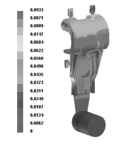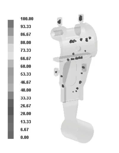 圖7 壓塊縮松分布 根據(jù)壓塊壓鑄件的結(jié)構(gòu)及模擬分析結(jié)果,設計出壓塊壓鑄件的半固態(tài)壓鑄模具,見圖8。半固態(tài)壓鑄模具在結(jié)構(gòu)上與一般的壓鑄模具相同,在生產(chǎn)前要對模具充分預熱,由于半固態(tài)的溫度較低,凝固時間短,因此模具在預熱時要比液態(tài)壓鑄高,一般在280~300℃,需在動、定模套板上設計加熱元件和測溫孔,安裝熱電偶測溫,以便控制模具溫度,同時要求模具各個部位溫度均勻穩(wěn)定。