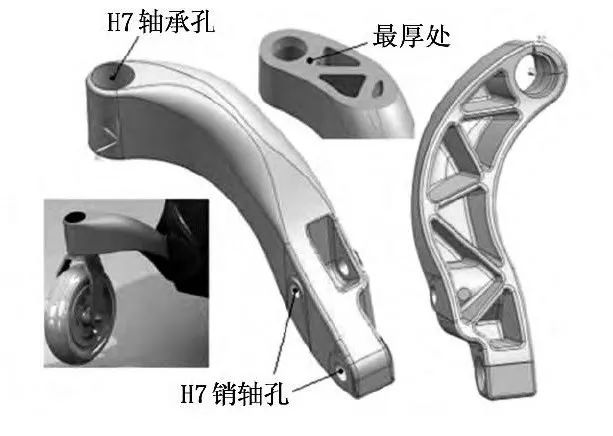 ![]() 原標題:廈門恩比爾:消除壓鑄鋁腳輪支架氣孔缺陷的措施 壓鑄件是在壓鑄機高壓作用下,使液態金屬以較高的速度充填壓鑄模型腔并在壓力下凝固成形的零件。由于液態金屬充填速度極快,型腔中氣體很難及時排出。因此,壓鑄件常有氣孔和氧化夾雜物存在,從而影響了壓鑄件的品質。降低壓鑄件的氣孔缺陷(尤其對于厚壁的壓鑄腳輪支架)是壓鑄生產的一大難點。壓鑄鋁腳輪支架由于其結構具有筋條多、壁較厚且不均勻的特點,易產生氣孔、縮松等缺陷。以鋁壓鑄腳輪支架為例,通過分析腳輪支架結構,設計合理的澆注系統使鑄件利于排氣和補縮,在生產中掌握好鋁液熔煉工藝要點,總結一些有關厚壁鋁壓鑄件解決氣孔問題的生產經驗。開始時采用傳統壓鑄工藝,結果很不理想,廢品率達50%。通過對腳輪支架零件進行工藝分析后,改用慢壓射工藝,加厚內澆口為4mm,壓射速度為0.4m/s,廢品率降到20%。進一步提高合金品質,改進排氣方式,廢品率最終降至1%。 圖文結果 腳輪支架是電動輪椅車底盤上的一個重要部件,見圖1。材質為ADC10,部件前端軸承孔和尾部兩處銷軸孔采用CNC機加工,孔位預留加工余量。鑄件加工面不允許存在氣孔、縮松等缺陷,鑄件表面最后做噴粉處理。鋁壓鑄腳輪支架外形尺寸為260mm×220mm,平均壁厚達到8mm,在充型過程中容易卷氣,形成氣孔類缺陷。毛坯最厚部位在軸承孔靠腳輪支架內面邊上(見圖1),厚度達15mm左右,容易產生縮松缺陷。