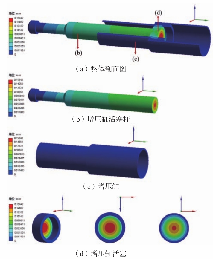 圖11 液壓缸部分等效應變云圖 3.3 增壓缸部分變形、應力和應變分析 增壓缸部分產生的總變形云圖如圖12所示。增壓缸活塞桿右端受到來自增壓缸活塞傳遞過來的壓力,在右端面產生了最大變形,達到了0.158 mm,僅在中心較小面積范圍內達到了最大變形值。在增壓缸活塞桿的右端面上,沿著徑向方向向外,變形量逐漸減小,在最外圈達到最小值,約為0.089 mm。在增壓缸活塞桿的長度方向上,變形量從右至左逐漸減小。增壓缸由于與壓鑄機機座保持剛性固定,因此其外接觸面設置為固定支撐約束,其變形量幾乎為0。增壓缸活塞右端面受到來自右端液壓油的壓力,產生最大變形值0.158 mm,最大變形涉及范圍大致為增壓缸活塞桿的截面積。增壓缸活塞左端面與增壓缸活塞桿進行接觸的部分同樣達到了最大變形值0.158 mm,但其最大變形涉及的面積范圍明顯小于活塞右端面,沿著活塞左端面的徑向方向向外,變形量逐漸減小,活塞外圈部分產生的變形幾乎為0。