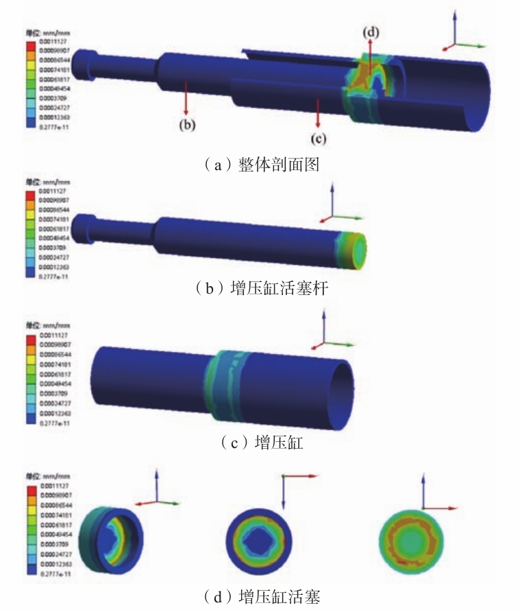 圖13 增壓缸部分等效應力云圖 增壓缸部分所受等效應變云圖如圖14所示,增壓缸活塞桿右端面的等效應變由中心處往外逐漸增大,中心處等效應變為0.000 37 mm/mm,邊緣處等效應變為0.000 98 mm/mm。增壓缸應變最大值出現在兩管相接觸的位置,最大等效應變值為0.000 74 mm/mm。增壓缸活塞右端接觸液壓油,等效應變的分布情況為由中心往外逐漸增大,邊緣處最大等效應變值為0.00109 mm/mm。增壓缸活塞左端的最大等效應變出現在與增壓缸活塞桿右端外圈接觸的圓上,最大等效應變為0.001 11 mm/mm。活塞接觸活塞桿的端面,從壓射桿外圈直徑的位置,沿徑向方向,由內逐漸減小,增壓缸活塞的中心位置所受的等效應變大小為0.000 35 mm/mm;沿徑向方向,由外也逐漸減小,增壓缸活塞的外圈位置所受的等效應變大小為0.000 58 mm/mm。