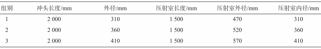 圖14 增壓缸部分等效應變云圖 3.4 沖頭尺寸的影響 經計算結果以及生產實踐經驗知道,壓鑄機的沖頭和壓射室是壓鑄機重要的組成部分,尤其是沖頭,在壓鑄送料過程中最容易失效。沖頭的長徑比是影響沖頭使用性能的重要因素之一,因此需要對其進行重點研究。沖頭尺寸已進行模擬計算的具體尺寸為長度2 000 mm,直徑360 mm,所對應的壓射室尺寸為:長度1 500 mm,外徑520 mm,內徑360 mm。另設計了不同尺寸的沖頭參數,并配合沖頭直徑,相應改變了壓射室內徑,保持壓射室厚度不變的情況下,相應調整壓射室的外徑,沖頭與壓射室的具體尺寸參數如表2所示。