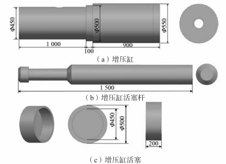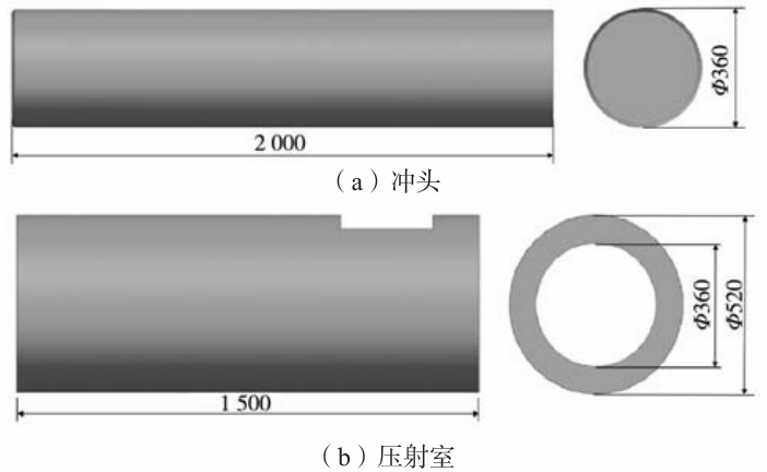 圖2 壓射系統裝配數值模型 壓射室部分具體尺寸如圖3所示,液壓缸部分具體尺寸如圖4所示,增壓缸部分具體尺寸如圖5所示。