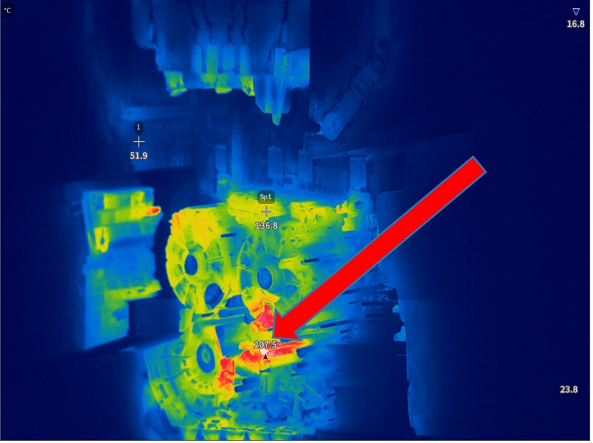 表3 模溫控制系統以高精度、高一致性和廣泛測溫范圍為核心技術特點,其性能上限充分體現了系統在復雜工業環境中的卓越適應能力和可靠性。以下關鍵參數具體描述了系統的技術性能和應用價值: 1、全量程測溫精度:系統實現了±2℃或±2%的測溫精度,能夠滿足壓鑄過程中對模具表面溫度監測的嚴苛要求。精確的測溫數據不僅有助于識別溫度異常點,還為模溫調節提供了可靠依據,有效避免因溫差波動引發的鑄件缺陷,如縮痕、裂紋和氣泡等; 2、測溫一致性:系統的測溫一致性高達±1℃或±1%,能夠確保不同時間和空間點的溫度數據始終保持高度一致。這種特性在壓鑄生產的連續性過程中尤為重要,能夠提供穩定的熱分布監測,為精準調控工藝參數提供支撐; 3、環境溫度適應性:系統能夠在-30℃至100℃的環境溫度范圍內穩定運行,適應壓鑄現場的極端工作環境。這種環境適應能力確保了系統在嚴苛條件下仍能提供可靠的測溫結果,為長期工業應用奠定了堅實基礎; 4、測溫范圍:系統的測溫范圍覆蓋了-20℃至650℃,全面滿足了模具從低溫預熱到高溫壓鑄的全過程需求。廣泛的測溫范圍使系統適合于多種不同工藝要求,具有更高的通用性和靈活性; 5、紅外像素分辨率:系統配備了640×480像素的紅外熱像儀,以其高分辨率實現清晰的熱成像效果。成像細節豐富,能夠直觀展現模具表面的熱分布狀態,為工程師提供精準的視覺分析工具。此外,高像素分辨率確保了測溫的點密度和分辨率,能夠準確測量直徑為10mm的小目標區域溫度。 通過上述關鍵參數,系統展示了其在壓鑄工藝中的卓越性能,具備實時、高效、精準的模具溫度監測能力。這些技術性能不僅有助于改善鑄件質量,還顯著提高了生產效率,降低了資源浪費和維護成本,為現代化壓鑄生產提供了強有力的技術支持。 3實驗驗證 3.1 實驗設計 在壓鑄生產過程中,模具溫度的控制至關重要,尤其是在噴涂后冷卻階段。通常,噴涂后的模具溫度應迅速降低至150℃左右,以確保良好的鑄件質量,并避免由于過高的溫度導致零部件局部的應力集中和裂紋生成。然而,在某一生產批次中,銷釘部位的溫度冷卻后仍然保持在216℃,遠高于理想溫度,進而導致生產出的零部件在該部位經常發生開裂現象。由于在之前的生產過程中未使用熱成像技術,生產團隊未能及時發現冷卻系統的問題,只有在零部件質量異常的情況下,才意識到該部位可能存在溫度控制問題。如圖1所示