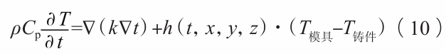 式中:F為液體的占據比例(0為無液體,1為全液體)。 以準確預測液態金屬的流動行為。緊接著,在充型完成后,鑄件進入凝固階段,此時冷卻速率和熱節分布直接影響內部質量。為此,通過能量方程來模擬凝固過程中的溫度場變化: