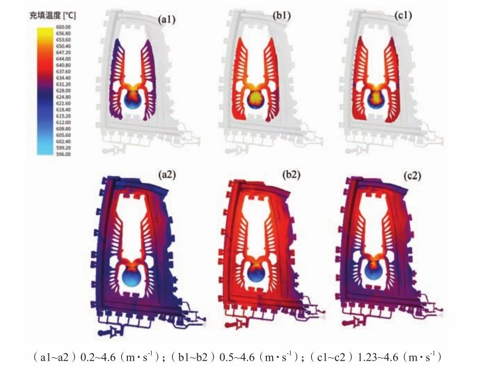 圖7 汽車車門充型時間分布圖 3.4 不同壓射速度對充填溫度的影響 分別模擬了三種不同壓射速度(A 0.2~4.6 m/s、B0.5~4.6 m/s、C 1.23~4.6 m/s)對充填溫度的影響,結果如圖8所示。方案A熔體充填過程中澆口充填溫度均勻,但料管到內澆口溫度下降較快,對金屬流動性有一定影響。充型完后發現熔體整體溫度偏低,且鑄件上半部位出現局部溫度梯度較大。方案B充填溫度并不均勻,明顯右下角的澆口溫度下降較快。充型完后發現熔體整體溫度趨于一致且溫度大部分為640 ℃左右,熔體雖然能夠順利填充遠端,易導致過熱或冷卻時間過長。方案C在澆口的充填溫度均勻,料管到內澆口的溫度梯度較小,金屬流動性較好。