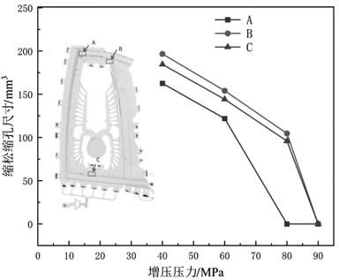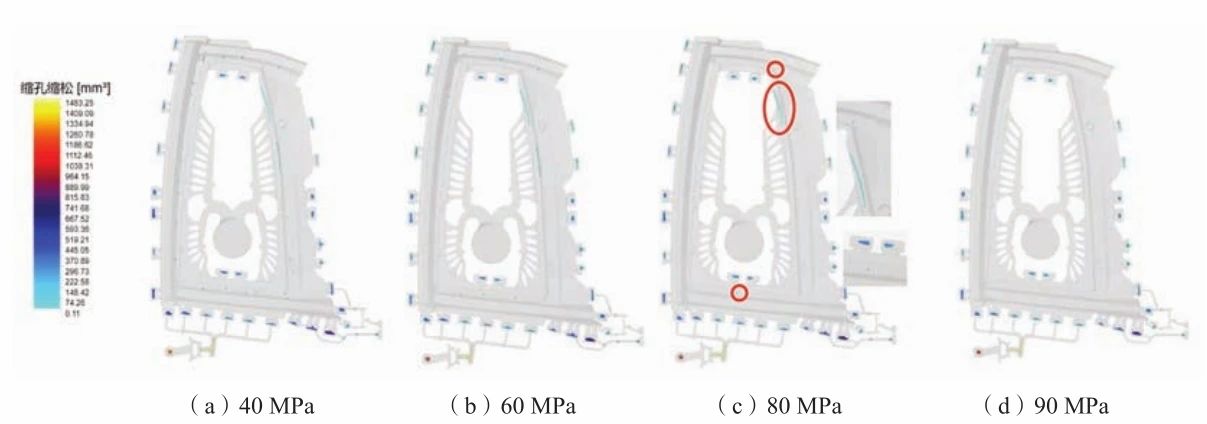 圖8 汽車車門充型溫度場分布圖 整體而言,方案A充填溫度均勻且金屬流動性較好,但溫度下降較快。方案B充填溫度并不均勻,充型完后熔體溫度趨于一致且溫度大部分為640 ℃左右,同時易導致過熱或冷卻時間過長。方案C充填溫度均勻且金屬流動性較好。 3.5 不同增壓壓力對縮松縮孔的影響研究 對方案C在不同增壓壓力40 MPa、60 MPa、80 MPa和90 MPa條件下凝固縮孔進行對比分析,結果如圖9所示。當增壓壓力為40 MPa時,縮松縮孔主要分布在近澆口四周,且縮松縮孔缺陷較多;當增壓壓力為60 MPa時,縮松縮孔分布基本上只有上下兩側;當壓力提升到80 MPa時,縮松縮孔分布在近澆口處和上下側各一處;當壓力提升到90 MPa時,無縮松縮孔。通過缺陷尺寸圖9(a)至圖9(d)發現,A點缺陷在40 MPa、60 MPa、80 MPa和90 MPa時,尺寸分別為199.1 mm3、154.06 mm3、104.63 mm3和0,說明隨著增壓壓力增大該點缺陷呈減小趨勢直至被補縮。其中選取了鑄件上三個位置點A、B和C,其縮孔缺陷尺寸大小隨增壓壓力變化趨勢如圖10所示。