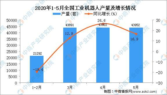 2020年5月全國工業機器人產量為43952套,同比增長16.9%。