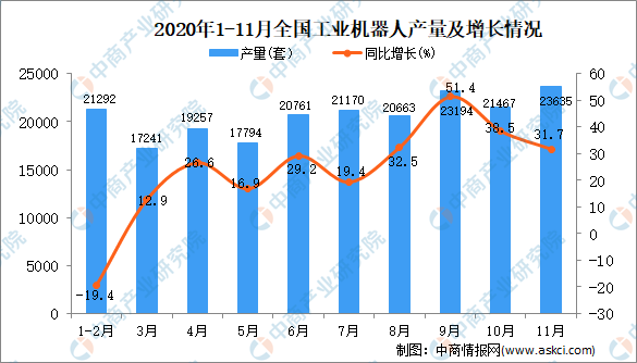 2020年11月全國工業機器人產量為23635套,同比增長31.7%。1-11月全國工業機器人產量為206851套,同比增長22.2%。
