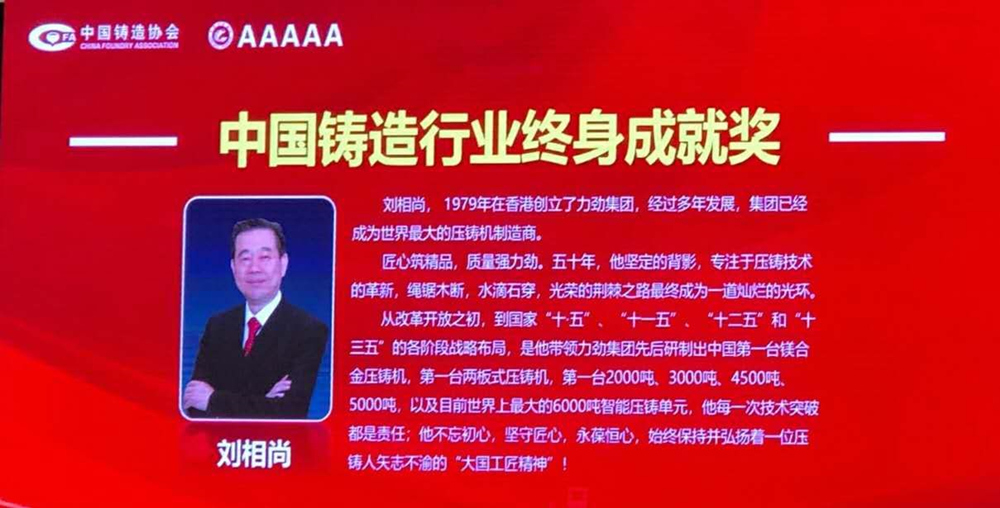 8月16日,在第十六屆中國鑄造協會年會活動上,開幕式上表彰了行業優秀個人。力勁集團創始人劉相尚先生被授予“中國鑄造行業終身成就獎”。
