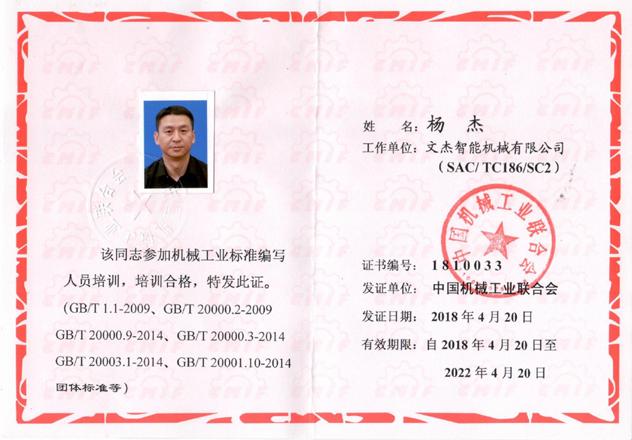 結(jié)業(yè)證書 去年,文杰智能加入成為全國鑄造機(jī)械標(biāo)準(zhǔn)化技術(shù)委員會金屬熱成形分技術(shù)委員會(SAC/TC186/SC2),積極參與鑄造行業(yè)專業(yè)標(biāo)準(zhǔn)的起草。今年4月,公司董事長楊杰先生參與中國機(jī)械工業(yè)聯(lián)合會組織的標(biāo)準(zhǔn)編寫人員培訓(xùn),通過考試取得結(jié)業(yè)證書,成為壓鑄線性機(jī)器人領(lǐng)域首位獲此證書的專業(yè)人員。 順應(yīng)智能制造的潮流,受益于國家政策扶持,未來,文杰智能將更加堅(jiān)定壓鑄線性機(jī)器人的步伐和定位,積極作為,為壓鑄行業(yè)發(fā)展添磚加瓦,朝向行業(yè)領(lǐng)導(dǎo)者的目標(biāo)不斷前進(jìn)。 溫馨提示:“2018中國國際壓鑄會議暨展覽會(CHINA DIECASATING)”將于7月18-20在上海新國際博覽中心舉行,文杰智能將攜最新壓鑄線性機(jī)器人產(chǎn)品及應(yīng)用解決方案出席,屆時(shí)歡迎行業(yè)同仁蒞臨參觀指導(dǎo)。展位號:N1D32 |