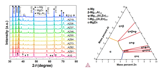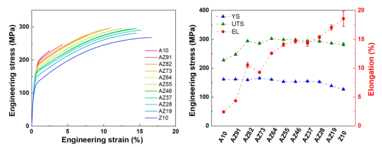 不同Al/Zn比的半固態(tài)注射成型Mg-Al-Zn合金相組成演變 ?相組成:隨著Al/Zn比例降低,合金中析出相由連續(xù)網(wǎng)狀Mg??Al?? 逐漸轉(zhuǎn)變?yōu)楣铝K狀MgZn,中鋁中鋅合金(如AZ64–AZ28)中則形成Mg-Al-Zn三元金屬間化合物。 ?二次相含量:Mg-10Al合金中二次相面積分數(shù)為12.8%,隨Zn含量增加先降后略升,Mg-10Zn合金中為10.7%。 ?晶粒結(jié)構(gòu):所有合金均獲得均勻細小的等軸晶組織,平均晶粒尺寸介于4.4-6.3 μm,且織構(gòu)隨機分布,無顯著擇優(yōu)取向。 2 力學性能分析