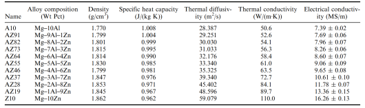 不同Al/Zn比的半固態(tài)注射成型Mg-Al-Zn合金力學性能 ?強度:隨著Al含量增加,屈服強度呈上升趨勢,Mg-10Al合金YS最高達161.4 MPa,主要歸因于大量Mg??Al??相的強化作用。 ?塑性:Zn含量的提升顯著改善合金塑性,Mg-10Zn合金伸長率最高達18.56%,這與Zn固溶促進非基面滑移及塊狀MgZn相抑制微裂紋擴展有關(guān)。 ?強塑性匹配:中Al/Zn比合金(AZ64-AZ37) 表現(xiàn)出最優(yōu)綜合性能:YS > 153 MPa,UTS > 294 MPa, elongation > 12%。 3 熱/電導率行為