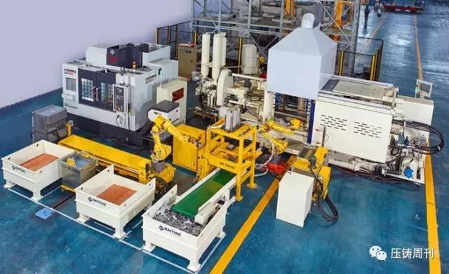 海天金屬自動化壓鑄集成系統 據悉,該方案以一臺HDC300伺服冷室壓鑄機為核心,包括自動給湯、機器人噴霧和取件、機器人冷卻和切邊、機器人CNC裝夾、CNC加工、機器人清洗、機器人碼垛等一系列自動化、無人化壓鑄集成系統。在此系統基礎上增加自動加原料裝置、產品輸送及AGV自動物流系統、智能工廠管理軟件,就可實現壓鑄企業“黑燈工廠”生產模式。 洪劍文接著說:“海天金屬是海天集團第五大產業,也是海天堅持‘產業相關、共性發展’戰略的全新布局。目前海天已成為全球規模最大的注塑機制造商,海天國際在港交所上市,海天精工在上交所上市;海天品牌、海天產品之所以能得到全球用戶認可是基于卓越的品質、高性價比的產品和優質的服務保障。我們希望海天金屬依托海天塑機、海天精工、海天驅動的產業平臺優勢,以‘技術領先、質量可靠、服務高效’為理念,為客戶提供性價比優越的壓鑄成套設備和完整解決方案,使客戶獲得具有競爭力的壓鑄產品生產能力。” 產品高端定位以服務全球市場 據介紹,海天金屬壓鑄機目前規劃有兩大系列:HDC系列和HDM系列(Die masting系列)。HDC系列主要面向國內中高端壓鑄客戶,以“可靠、耐用”為設計宗旨,對普遍存在的影響機器穩定性和使用壽命的問題進行重點解決,機器精密度、穩定性、速度及效率、安全性、耐用性顯著提高。技術團隊核心成員都是壓鑄機各專業十年以上高級工程師,擁有豐富的壓鑄機設計經驗。HDM系列主要面向全球高端壓鑄客戶,重點是汽車零配件市場。該系列機型由海天金屬與德國專業研發團隊共同開發,壓射系統在德國組裝和測試完成后,原裝進口到國內進行整機裝配,該系列高端重型機預計2018年推向市場。