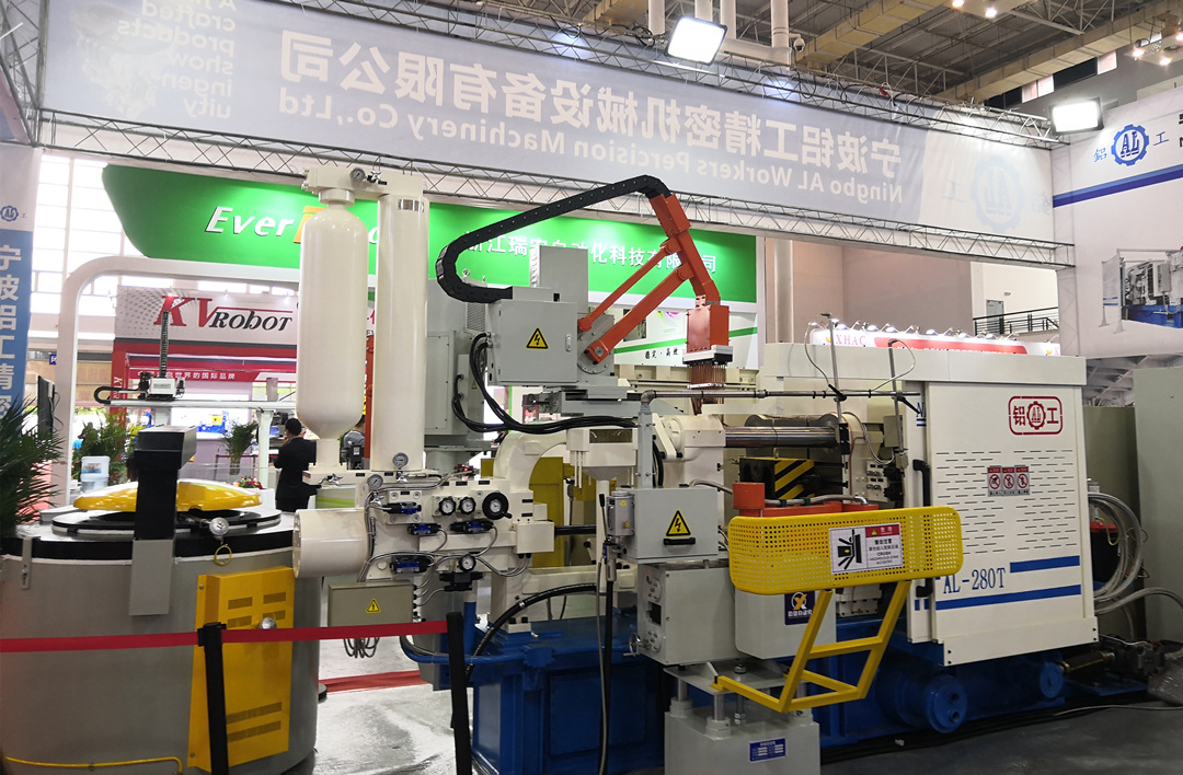 ![]() 寧波鋁工展臺 2021年4月22日-24日,“2021寧波國際鑄造及壓鑄展”在寧波國際會展中心舉行。100多家鑄造及壓鑄產(chǎn)業(yè)上下游企業(yè),集中亮相,同臺競技。作為寧波本土企業(yè)以及壓鑄機制造領(lǐng)域的新銳企業(yè)--寧波鋁工精密機械設(shè)備有限公司(下稱“寧波鋁工”),已連續(xù)第二年參加展會。 順應(yīng)壓鑄智能自動化的發(fā)展趨勢,在本屆展會上,寧波鋁工現(xiàn)場展示了一套以AL系列合模力280T冷室壓鑄機為主機,配置熔煉保溫爐、給湯機、噴霧機、取件機等自動化周邊設(shè)備的壓鑄自動化生產(chǎn)單元,吸引大批買家和專業(yè)觀眾關(guān)注和詢盤。 據(jù)介紹,鋁工AL系列冷室壓鑄機設(shè)計別樹一格,打破國內(nèi)主流和傳統(tǒng)壓鑄機結(jié)構(gòu)設(shè)計,在鎖模機構(gòu)、射出機構(gòu)、增壓缸內(nèi)部結(jié)構(gòu),進行了革新性的結(jié)構(gòu)設(shè)計,具有穩(wěn)定耐用、精確可靠、安全性高、故障率低等性能特點。 射出機構(gòu)是壓鑄機的核心機構(gòu)。AL系列冷室壓鑄機的射出機構(gòu),采用上下連接體結(jié)構(gòu)成“C型架”,提升了牢固性,加之兩邊均有定位機構(gòu),不會造成中心定位的偏倚,保證了射出桿和料管的超高同心度,解決了料管和柱塞頭的磨損,使其壽命更長。其打料采用油缸前腔控制,且只使用儲能器內(nèi)的油,杜絕因油缸后腔壓力變化而引起打料不穩(wěn),杜絕油泵及輸送油路對打料的影響,使打料更穩(wěn)定,大大提升壓鑄機打料部位的穩(wěn)定性。