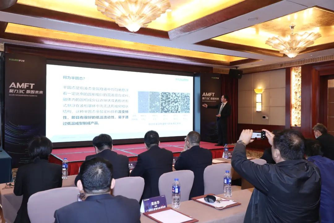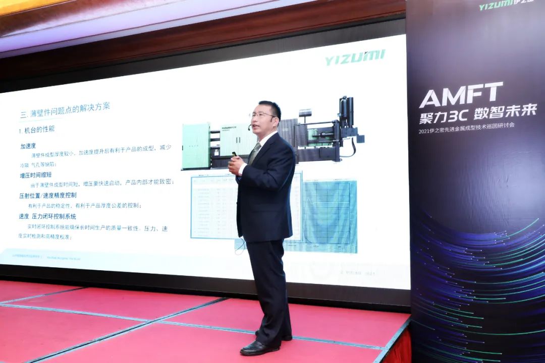伊之密技術專家們演講 研討會上,有著行業豐富經驗的伊之密技術專家們先后上臺,分享了升級版型H II系列冷室壓鑄機的研發成果,分析了薄壁件在壓鑄生產的缺陷及解決方案,以及半固態鎂合金注射成型機在3C類薄壁產品領域的應用優勢。