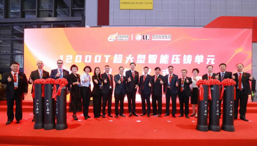 在展會開幕式后,力勁集團、廣東鴻圖科技股份有限公司(以下簡稱“鴻圖科技”)聯合舉行了12000T超大型智能壓鑄單元發布儀式。今年1月22日雙方簽訂該設備的購買協議,經過彼此近9月的不懈努力于近日完成生產總裝,迄今為止全球最大噸位的超級壓鑄機正式面世。