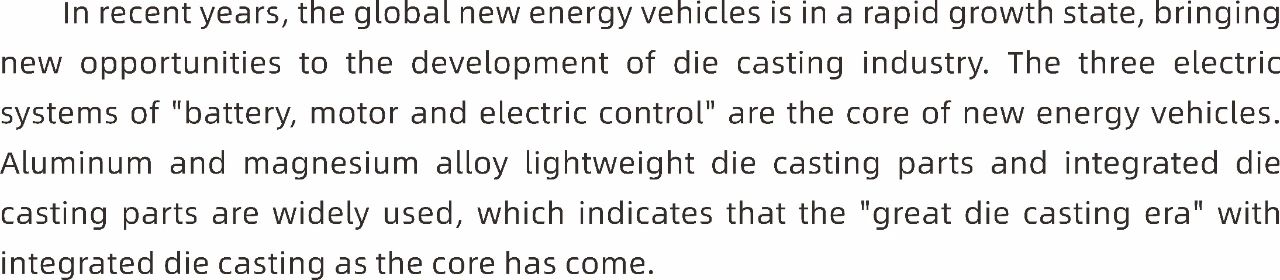 近年來,全球新能源汽車呈現高速增長狀態,給壓鑄行業發展帶來新機遇。“電池、電機、電控”三電系統是新能源汽車的核心,廣泛使用鋁、鎂合金輕量化壓鑄件和一體化壓鑄件,這標志著以一體化壓鑄為核心的“大壓鑄時代”已經來臨。