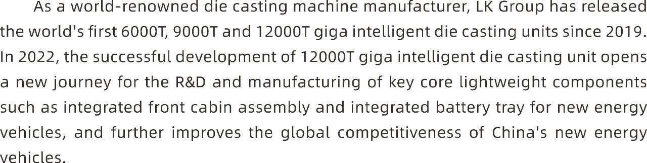 力勁集團作為全球知名的壓鑄機制造商,自2019年起至今,力勁陸續發布全球首創的6000噸、9000噸及12000噸超大型智能壓鑄單元。2022年,12000噸超級智能壓鑄單元的成功開發,為新能源汽車一體化前艙總成、一體化電池托盤等關鍵核心輕量化部件的研發、制造開啟了新征程,讓中國新能源汽車于全球的競爭力得以進一步提升。