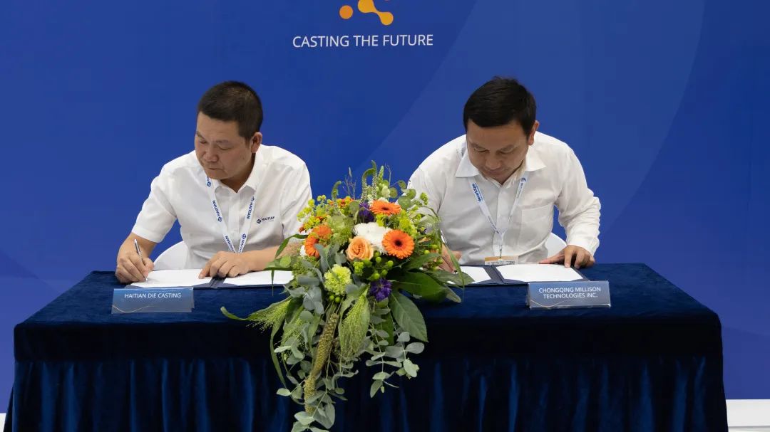 雙方簽約及來賓合影 美利信科技總部位于中國重慶,主要從事通信領域和汽車領域鋁合金精密壓鑄件的研發與生產。多年來,海天金屬與美利信科技達成緊密的戰略合作伙伴關系。本次GIFA展上,雙方共同簽署了全球戰略合作協議,宣布將聯合開發20000噸超大型壓鑄機設備,并將在大型及超大型壓鑄領域展開研發技術合作,實現成果共享。 強強聯合 助推新能源汽車行業高質量發展