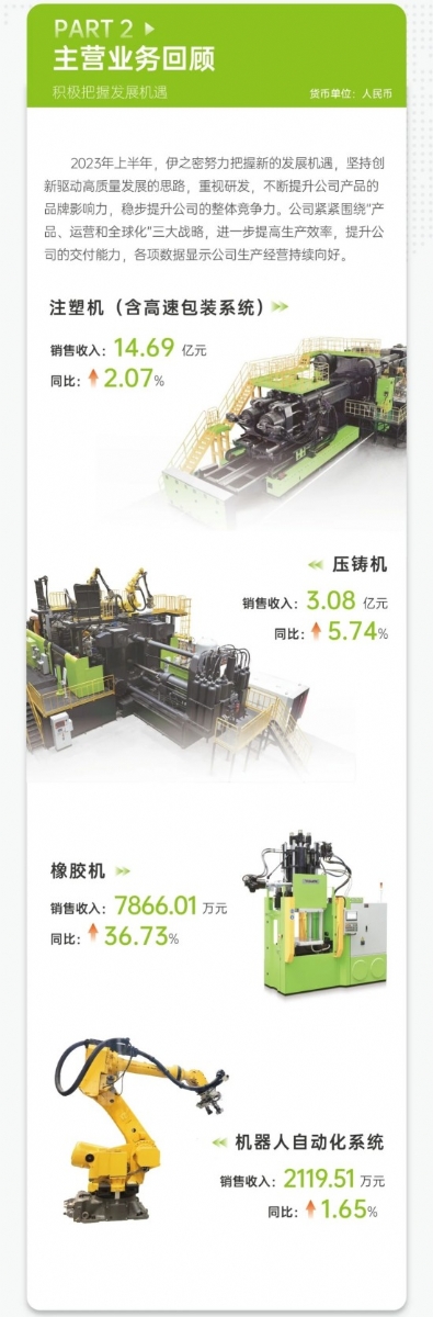 ![]() 8月30日,深交所上市企業--伊之密股份有限公司(簡稱:伊之密)在2023年上半年業績報告中表示,今年上半年,全球經濟形勢依然復雜多變,公司通過推出新產品、改變銷售策略、優化供應鏈管理等策略積極應對,努力提升公司業績。從公司所處行業來看,下游汽車行業繼續保持增長態勢,尤其在新能源汽車板塊,有較快速的增長,為公司帶來新的發展機遇。