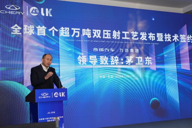 奇瑞新能源研發(fā)中心副總經(jīng)理茅衛(wèi)東致辭 在發(fā)布會(huì)上,深圳力勁科技董事長(zhǎng)劉卓銘先生表示,雙壓射技術(shù)創(chuàng)新對(duì)于力勁乃至整個(gè)壓鑄行業(yè)而言都具有十分重要的意義。同時(shí)感謝奇瑞汽車對(duì)力勁的認(rèn)可與信任,力勁將全力以赴投入資源,確保本次合作的超萬(wàn)噸雙壓射壓鑄設(shè)備研發(fā)成功。