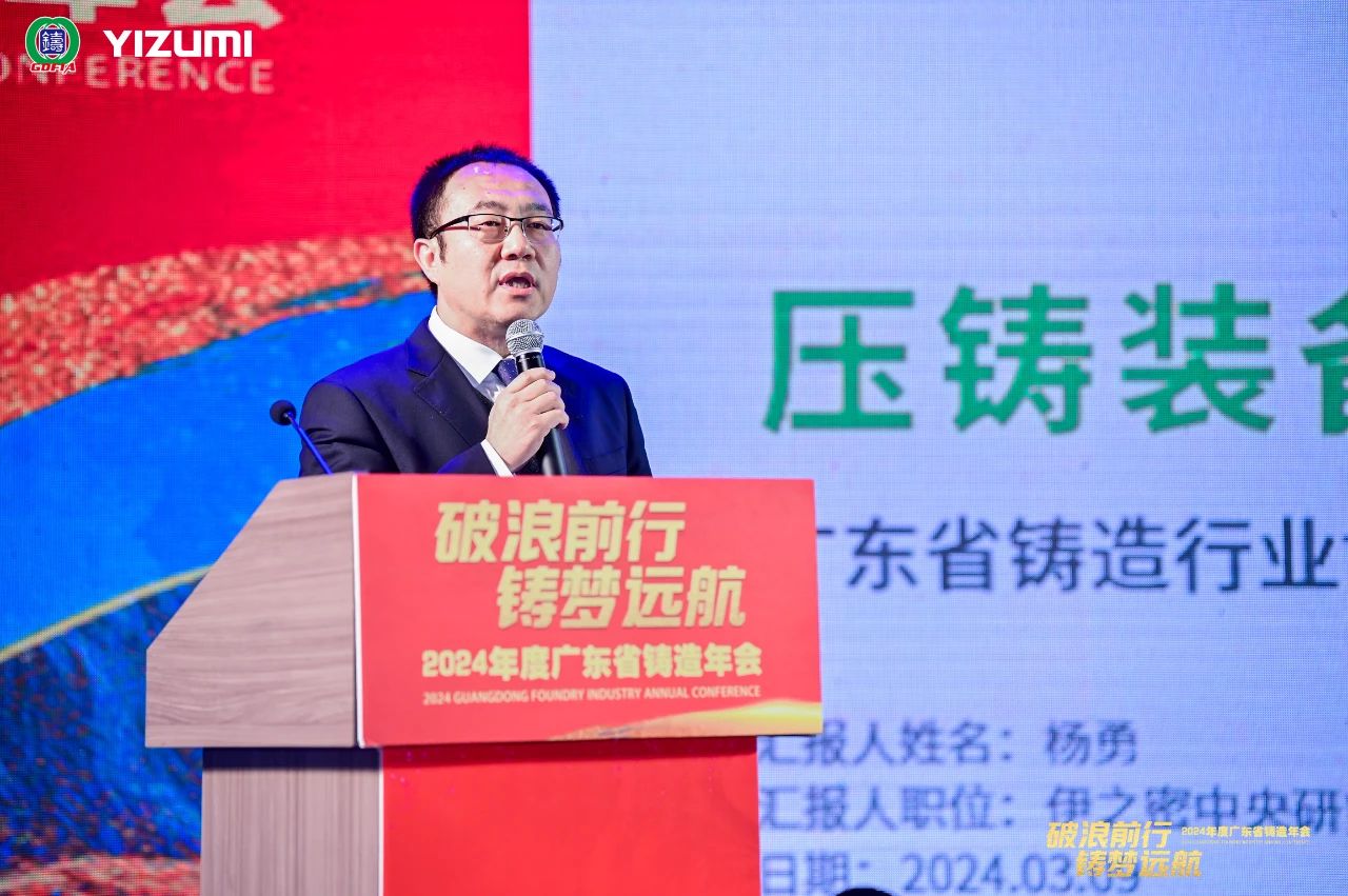 在參觀過(guò)程中,嘉賓們對(duì)壓鑄產(chǎn)業(yè)的前沿技術(shù)有了更深入的了解,還對(duì)伊之密在技術(shù)創(chuàng)新、產(chǎn)品研發(fā)以及市場(chǎng)拓展等方面的努力和成果表示高度贊賞。 聚焦前沿 共話壓鑄產(chǎn)業(yè)的創(chuàng)新路徑 當(dāng)天下午,伊之密股份有限公司中央研究院執(zhí)行院長(zhǎng)楊勇博士、伊之密股份有限公司壓鑄機(jī)事業(yè)部半固態(tài)市場(chǎng)經(jīng)理陳勇先生分別受邀參加廣鑄協(xié)年會(huì)開(kāi)幕式及學(xué)術(shù)交流論壇,并在會(huì)上分別做主旨報(bào)告和專題報(bào)告。 ? 楊勇 伊之密股份有限公司中央研究院執(zhí)行院長(zhǎng) 《壓鑄裝備企業(yè)創(chuàng)新體系建設(shè)實(shí)踐》 當(dāng)今時(shí)代,技術(shù)創(chuàng)新是企業(yè)核心競(jìng)爭(zhēng)力的重要來(lái)源。為確保創(chuàng)新可持續(xù)、常態(tài)化和成功率,企業(yè)需要建立、實(shí)施、保持現(xiàn)代創(chuàng)新管理體系。對(duì)此,伊之密股份有限公司中央研究院執(zhí)行院長(zhǎng)楊勇博士帶來(lái)《壓鑄裝備企業(yè)創(chuàng)新體系建設(shè)實(shí)踐》的主旨報(bào)告。