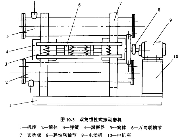 雙筒慣性式振動磨機(jī)的構(gòu)造如圖10-3所示。它由機(jī)座1,筒體2,5,彈簧3,激振器4,萬向聯(lián)軸節(jié)6,支承板7,彈性聯(lián)軸節(jié)8和電動機(jī)9等組成。雙筒振動磨機(jī)的粉磨筒體為串聯(lián)方式上下布置,它們之間通過文承板7互連在一起,而支承板由彈簧3支承在機(jī)座I上。在支承板中部裝有激振器,激振器主動上裝有可調(diào)式偏心塊,激振器主鈾通過彈性聯(lián)軸節(jié)與電動機(jī)相連接。當(dāng)電機(jī)通過彈性聯(lián)軸節(jié)帶動主軸轉(zhuǎn)動時,偏心塊產(chǎn)生離心力使筒體產(chǎn)生振動,物料從上筒體5的—端給入,在筒內(nèi)受到粉磨介質(zhì)的激烈振動沖擊磨剝作用粒度變小,并運(yùn)動了筒體另一端,從排料門給入到筒體2進(jìn)行粉磨,粉磨達(dá)到產(chǎn)品粒度要求p則從下筒體的誹料口排出。當(dāng)產(chǎn)品粒度要求較粗時,也可采用兩個筒體并列布置的方式,被磨物料僅通過一個粉磨筒體,則可獲得兩倍的臺時產(chǎn)量。