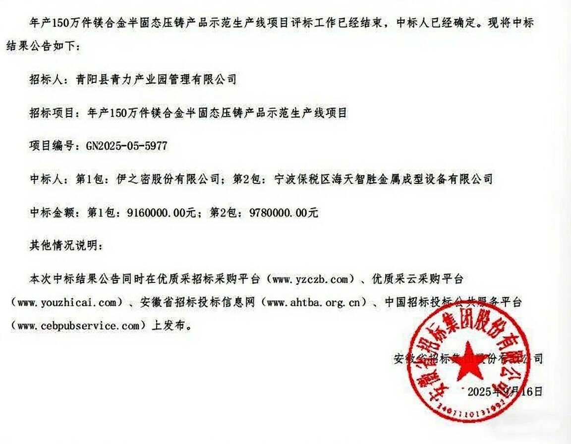 伊之密股份有限公司成功中標物產中大舜富(安徽)鎂業科技有限公司壓鑄機及配套設備招標項目,中標金額1.0396億元。