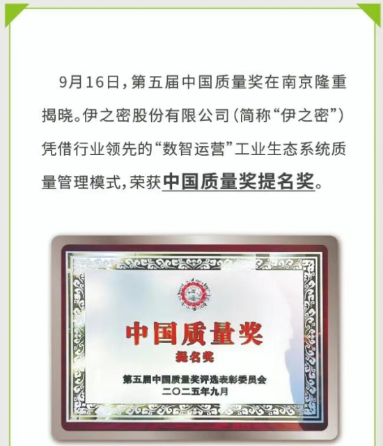 伊之密榮膺第五屆中國質量獎提名獎,將繼續聚焦“數智高效、全球運營、綠色發展”三大戰略方向。