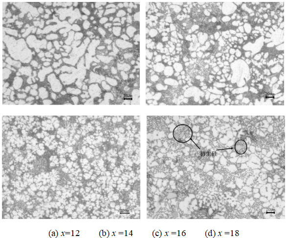 壓鑄鋁合金ZL102室溫組織中的物相包括初生α(Al)、鋁硅共晶組織、初晶硅以及少量的金屬間化合物。固溶處理后,壓鑄鋁合金ZL102中的硅相發生了熔斷和球化。