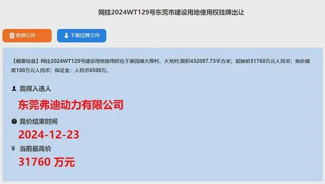 12月5日,東莞弗迪動力有限公司以總價51181萬元競得位于東莞市謝崗鎮大厚村、大龍村一宗建設工業用地,宗地面積為696339.35平方米。