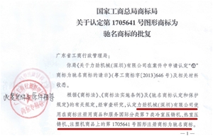 根據(jù)有關(guān)規(guī)定,認定力勁機械(深圳)有限公司使用在商標(biāo)注冊用商品和服務(wù)國際分類第7類冷室壓鑄機、熱室壓鑄機、注塑機商品上的第1705641號圖形注冊商標(biāo)為馳名商標(biāo)。