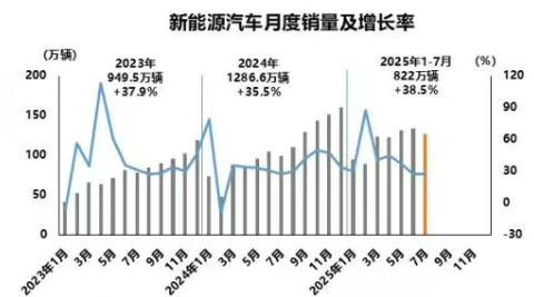 尤為引人關注的是新能源汽車市場。7月,新能源汽車產銷分別完成124.3萬輛和126.2萬輛,同比分別增長26.3%和27.4%,新能源汽車新車銷量達到汽車新車總銷量的48.7%,接近半數,市場滲透率進一步提升。 據中國汽車工業協會分析,7月車市進入傳統淡季,部分廠家安排年度設備檢修,導致產銷節奏有所放緩,環比呈現季節性回落。不過,從行業市場環境來看,以舊換新政策效果持續顯現,行業綜合整治“內卷”工作取得積極進展,企業新車型不斷投放市場,這些因素共同助力車市平穩運行,實現了同比正增長。 2025年1-7月,汽車市場整體保持增長態勢。1-7月,汽車產銷分別完成1823.5萬輛和1826.9萬輛,同比分別增長12.7%和12%,產銷增速較1-6月分別擴大0.2個和0.6個百分點。其中,乘用車產銷分別完成1583.8萬輛和1584.1萬輛,同比分別增長13.8%和13.4%;商用車產銷分別完成239.7萬輛和242.8萬輛,同比分別增長6%和3.9%。1-7月汽車出口368萬輛,同比增長12.8%。 新能源汽車在1-7月同樣表現出色。新能源汽車產銷分別完成823.2萬輛和822萬輛,同比分別增長39.2%和38.5%,新能源汽車新車銷量達到汽車新車總銷量的45%。從國內市場來看,新能源汽車國內銷量占汽車國內銷量比例為47.4%。同時,新能源汽車出口成績斐然,1-7月出口130.8萬輛,同比增長84.6%,成為推動汽車出口增長的重要力量。 |