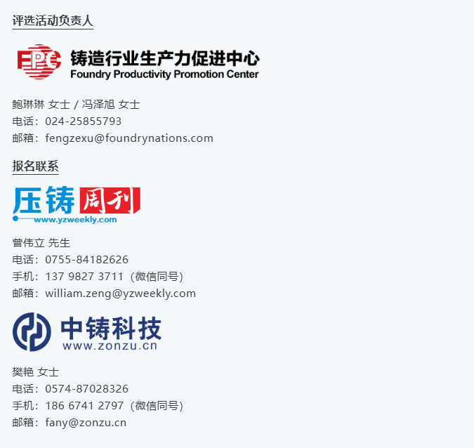 ![]() Award of Die Casting Innovative Technologies 創(chuàng)新技術(shù)評選活動(dòng) 歷經(jīng)20余年的高速發(fā)展,中國壓鑄行業(yè)目前已經(jīng)進(jìn)?到轉(zhuǎn)型升級的關(guān)鍵時(shí)期,協(xié)同創(chuàng)新與高質(zhì)量發(fā)展逐漸成為行業(yè)共識。為鼓勵(lì)及帶動(dòng)壓鑄行業(yè)相關(guān)企業(yè)技術(shù)與產(chǎn)品創(chuàng)新,在全行業(yè)形成創(chuàng)新風(fēng)尚,提升企業(yè)競爭力,鑄造行業(yè)生產(chǎn)力促進(jìn)中心自2017年起在全行業(yè)組織開展“壓鑄行業(yè)年度創(chuàng)新技術(shù)與產(chǎn)品評選”活動(dòng)。截止目前,共認(rèn)定及表彰國內(nèi)外壓鑄領(lǐng)域創(chuàng)新技術(shù)與產(chǎn)品100余項(xiàng),極大的促進(jìn)了我國壓鑄行業(yè)的發(fā)展與技術(shù)進(jìn)步。 ♦ 提示:活動(dòng)全程不收取任何費(fèi)用! 2026 現(xiàn)將2026年度全國壓鑄行業(yè)創(chuàng)新技術(shù)與產(chǎn)品評選活動(dòng)相關(guān)事宜通知如下,歡迎相關(guān)企業(yè)及單位積極參與。 參與企業(yè)范圍 壓鑄及有色鑄造全產(chǎn)業(yè)鏈及上下游相關(guān)企業(yè)。 參評范圍 評選對象包括壓鑄及有色鑄造行業(yè)的創(chuàng)新產(chǎn)品、創(chuàng)新技術(shù)、創(chuàng)新材料、創(chuàng)新工藝、創(chuàng)新應(yīng)用等。