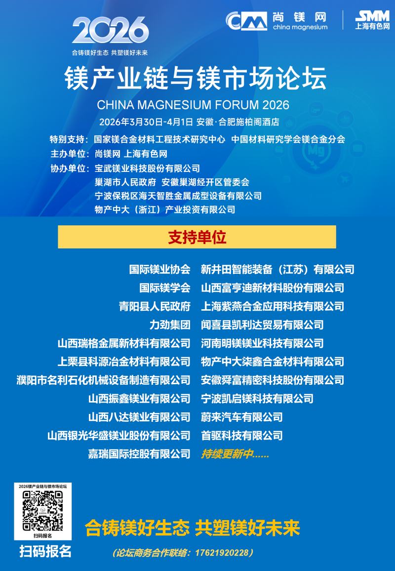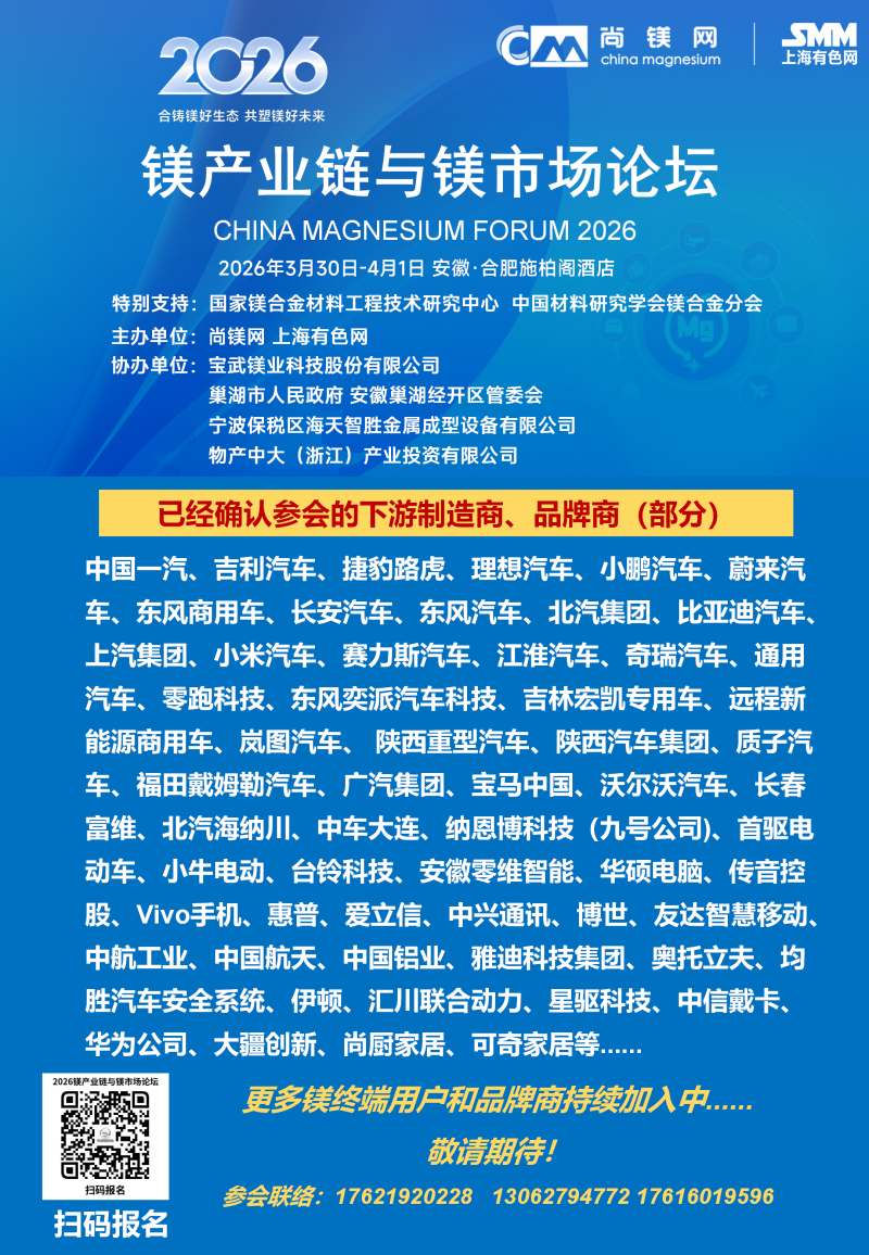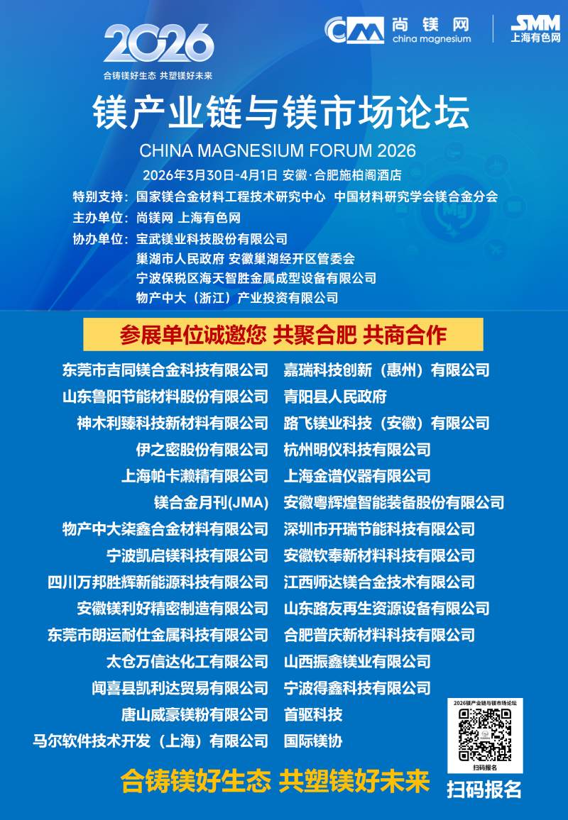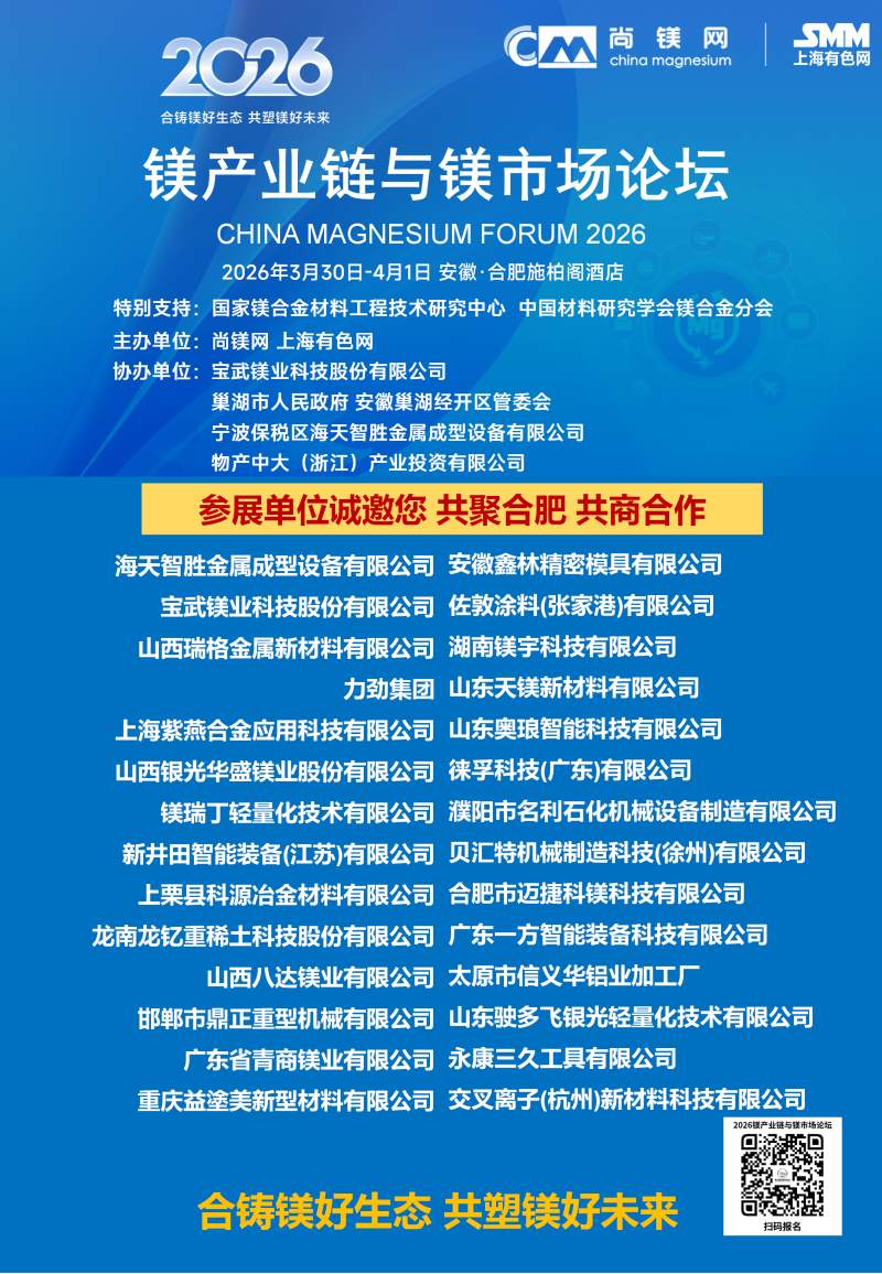 ![]() 2026年的鎂行業,正站在供需改善、需求爆發、政策加持的關鍵拐點,一場屬于鎂合金的春天正在到來。春光不等人,商機不重來。當下正是布局鎂產業鏈、鎖定訂單、拓展渠道、升級技術的黃金窗口期。值此時刻,"2026鎂產業鏈與鎂市場論壇"將于3月30日-4月1日在合肥市盛大啟幕。論壇由國家鎂合金材料工程技術研究中心、中國材料研究學會鎂合金分會特別支持,尚鎂網、上海有色網聯合主辦,寶武鎂業科技股份有限公司、巢湖市人民政府、安徽巢湖經開區管委會、寧波保稅區海天智勝金屬成型設備有限公司、物產中大(浙江)產業投資有限公司等單位協辦,得到了鎂產業鏈眾多骨干企業的支持和參與。這將是本論壇連續第四年舉行。 本次論壇的主題是:合鑄鎂好生態,共塑鎂好未來。論壇的目的是及時交流鎂行業與市場信息,研討鎂制造和應用的前沿科技,為鎂產業鏈企業商業合作、投資合作提供機會,同時,鎂產業鏈各方將借此機會集中展現創新成果,在關鍵時刻在關鍵議題上為鎂行業發聲,營造鎂產業良好發展的氛圍,共商共議構建新型鎂產業生態鏈,助推鎂材料的規模化應用。 本屆論壇亮點紛呈:匯聚強大的論壇合作單位,凝聚行業最硬核力量,30家產業鏈企業及機構鼎力合作搭建鎂交流平臺。特邀32位有影響力和權威性的專家、企業高管發表致辭和演講,高密度分享鎂研發前沿科技、產業化成果及經驗。廣泛邀請全產業鏈相關方深度參與,搭建高效交流平臺,目前已有國內領先的鎂及鎂合金企業、零部件制造企業、30余家整車企業、頭部兩輪電動車企業、知名3C領域制造商和品牌商、鎂產業相關裝備、表面處理企業、研發機構、投融資機構確認與會。今年首設鎂合金材料和汽車鎂合金平行論壇,更深入交流當前鎂市場熱點。將有55家鎂產業鏈骨干企業集中展示,展現他們的鎂合金技術、產品與相關服務。主辦方希望借此盛會,助大家見到更大的舞臺,望見更高的山峰,直面問題、打開格局、拓寬視野、攜手共進。 不負春光,實干興邦;聚力鎂業,共贏未來。讓我們以春為序,乘勢而上,把鎂生意做得更穩、更實、更火,共同開創中國鎂產業高質量發展新篇章! 您的參與也將是論壇成功舉辦的重要方面,期待與您在春暖花開之際,共赴一場“皖鎂之約”! 鎂業盛典 產業風標 2026鎂產業鏈與鎂市場論壇 2026年3月30日—4月1日 安徽·合肥施柏閣酒店