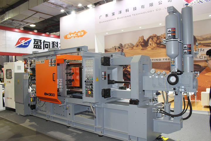 IMPRESS-PLUS 是IMPRESS 系列的延伸,包含鎖模力從130-900T的多個型號冷室壓鑄機。IMPRESS-PLUS 系列秉承了力勁機器一向的高品質及高穩定性,以好用易用的設計理念。配備全面的壓射控制系統,壓射工藝參數全電腦數字化設定,界面操作快捷簡便,采用閉環式設計,可按壓射統計數據,自動調整壓射快慢,提供穩定的壓射效能,有效延長模具的壽命及避免產品出現飛邊。 與此同時,IMPRESS-PLUS DCC280采用了智能調模系統,只需設定目標鎖模力,根據不同模具調整模厚,縮短換模時間。標配可變速伺服油泵,可有效縮短空循環時間,減少整機消耗功耗,節省最少50%的能耗。 廣東寶洋推介全新EM-J系列冷室壓鑄機 廣東寶洋科技有限公司(BMC)成立于2003年,是一家專業提供冷室壓鑄機、熱室壓鑄機機械及提供整體壓鑄技術解決方案的機械裝備制造企業。本屆展會,廣東寶洋推介最新一款EM-J系列冷室壓鑄機,新機型優化了拉桿結構,精準的慢壓射系統、全控制模具充填等特點。
